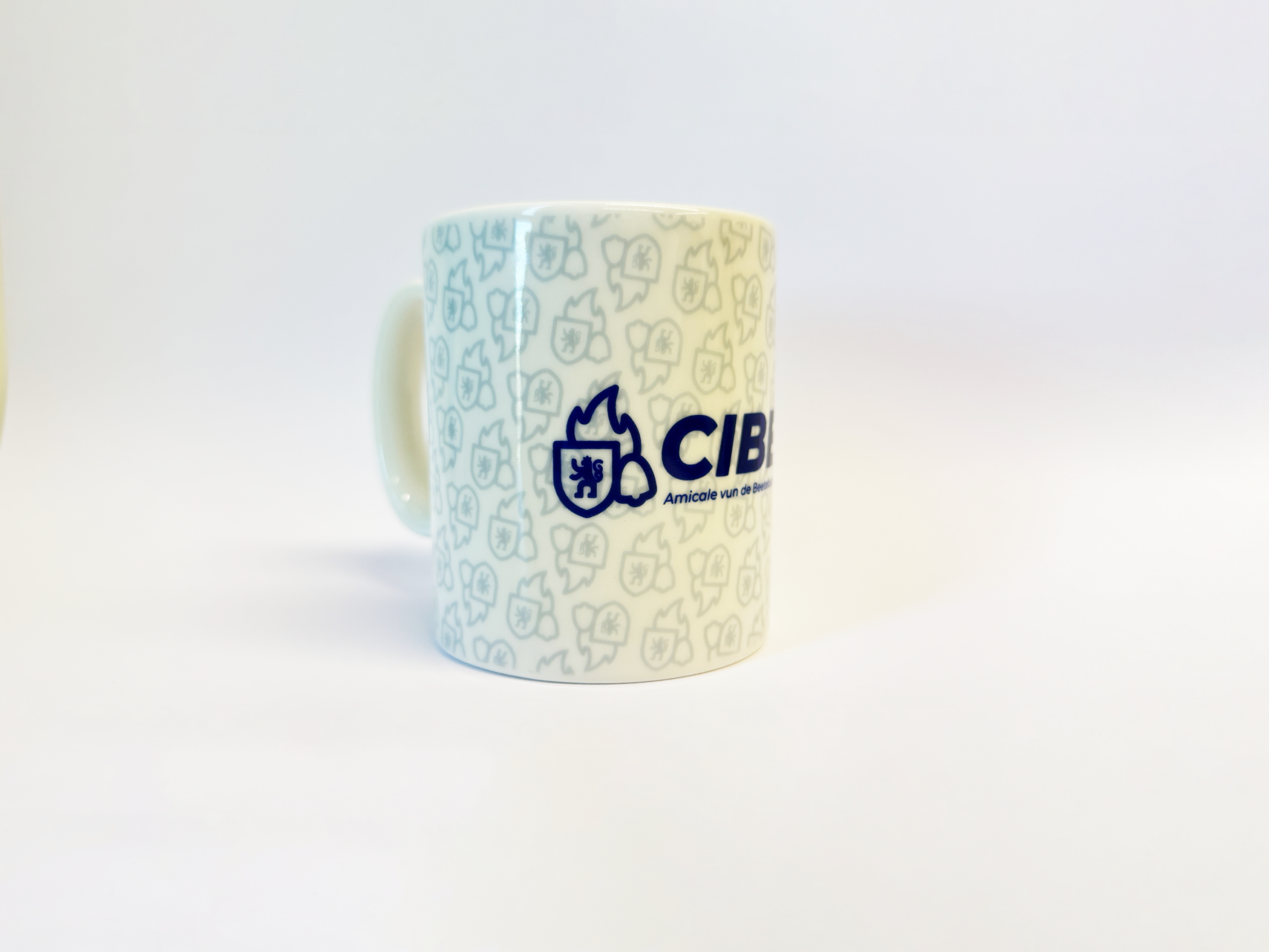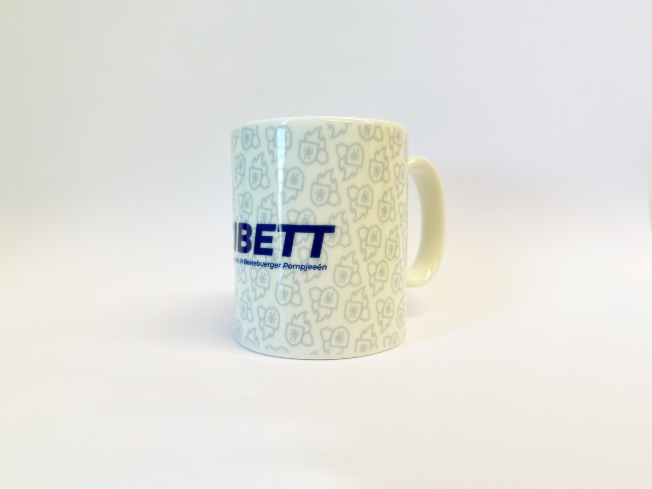 CIBETT-Tasse im Design des neuen Logos der Amicale vun de Beetebuerger Pompjeeën.